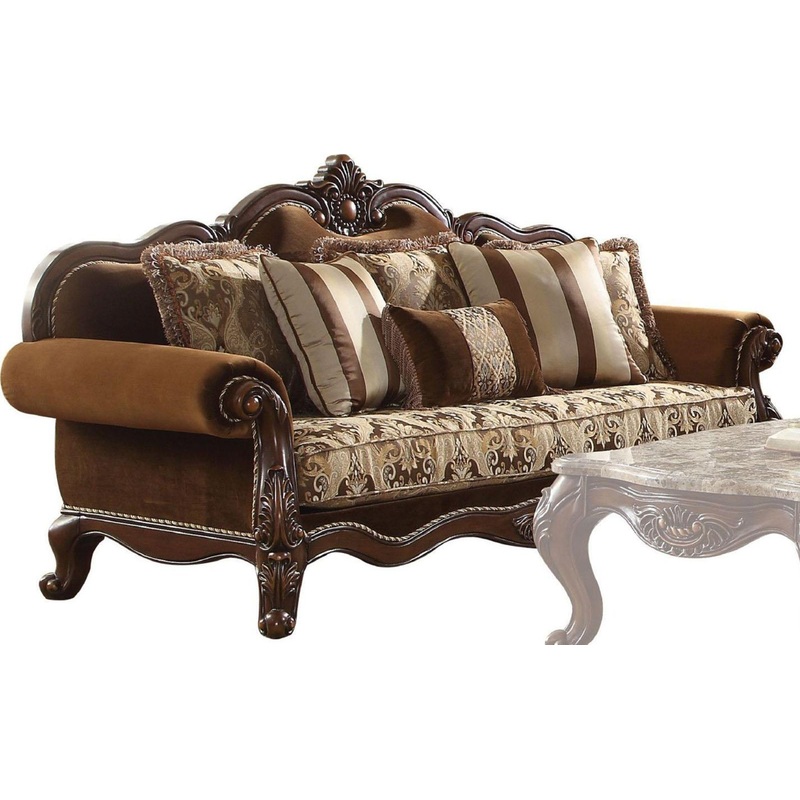 Jardena Collection by Acme Furniture Cherry Oak finish Crafted from hardwood, rubberwood and poplar solids Arched wooden trim Solid wood carvings Includes 6 pillows Nailhead trim Tight back and loose seat Rolled armrest Wooden scrolled legs