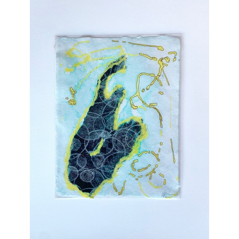 8.5 x 11 illistrated monoprint on handmade paper with gold paint from the series Invented Biology. Ready for framing.