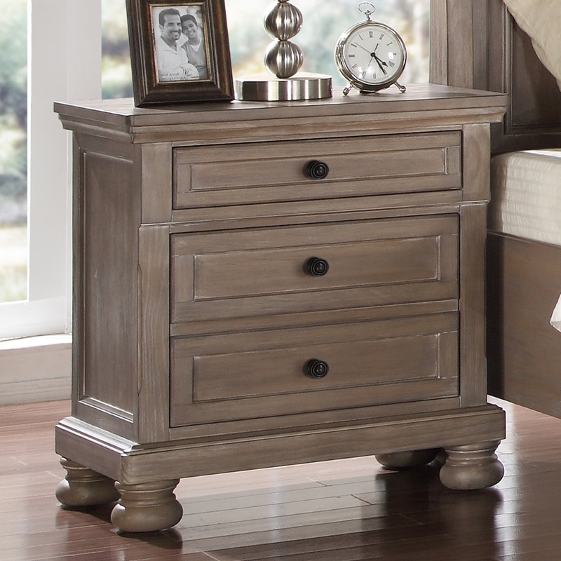 The Allegra 2-drawer nightstand blends function and contemporary style. This sturdy nightstand is constructed of hardwood solids and veneers then finished with a multi-step brushed pewter finish that is both stylish and easy to maintain. Two 5-piece drawer