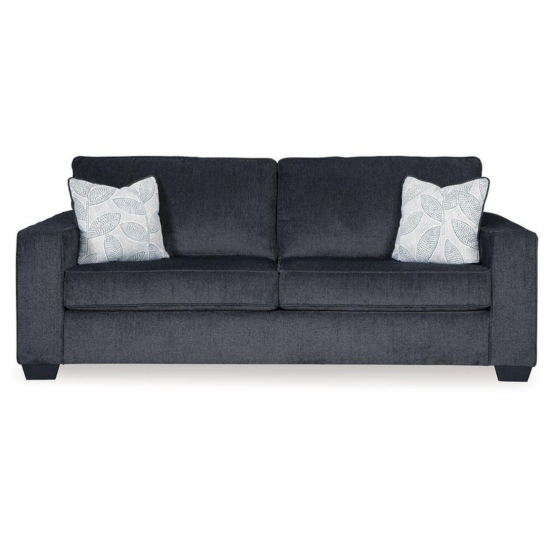If style is the question, then this sofa is the answer. Sporting clean lines and sleek track arms, the decidedly contemporary profile is enhanced with plump cushioning and a chenille-feel upholstery, so pleasing to the touch. Sure to play well with so many color schemes, this sofa in slate gray includes a pair of understated floral pattern pillows for fashionably fresh appeal.