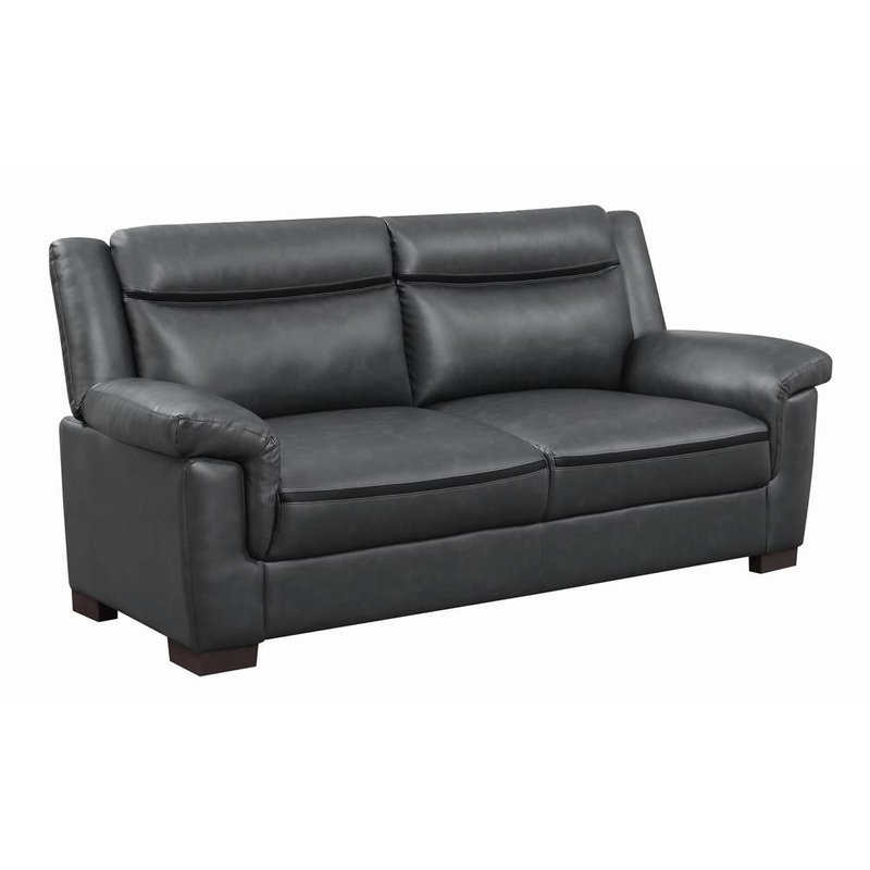 Elevate your living room with this sleek, modern sofa. Upholstered in soft, leathery material, it has a truly sophisticated look. Its comfortable, padded seating promotes soothing relaxation. Subtle stitching traces its frame for an updated touch of style. This sofa is offered in a variety of colors, giving you multiple options to match your decor.
