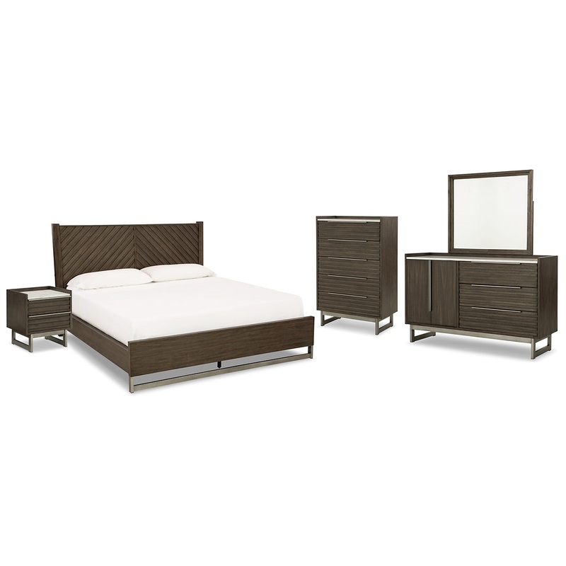 Clean lines lend sophistication and structure to this bedroom package. A complex rich grayish brown finish creates visual interest and adds to the contemporary vibe. SpecificationsDetailsB786B4: Includes king panel headboard and footboard with rails, Made