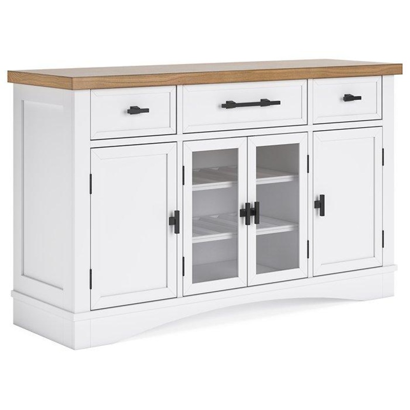 Casual style with substance. This dining server’s two-tone finish of classic white and butcher block oak veneer adds a relaxed vibe to a delicious design. Spacious cabinets and drawers provide out-of-sight storage, while black bar pulls exude modern farmhouse vibes. This charmingly curated piece is a show of great taste.