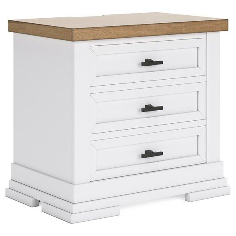 Casual style with substance. This two-tone nightstand raises the bar on comfortably cozy design in your soothing sanctuary. A sturdy silhouette with a classic white finish and black metal hardware exudes modern farmhouse vibes. The butcher block oak veneer top adds a relaxed aesthetic. And bedside charging for your go-to devices is made easy with power outlets and USB ports.