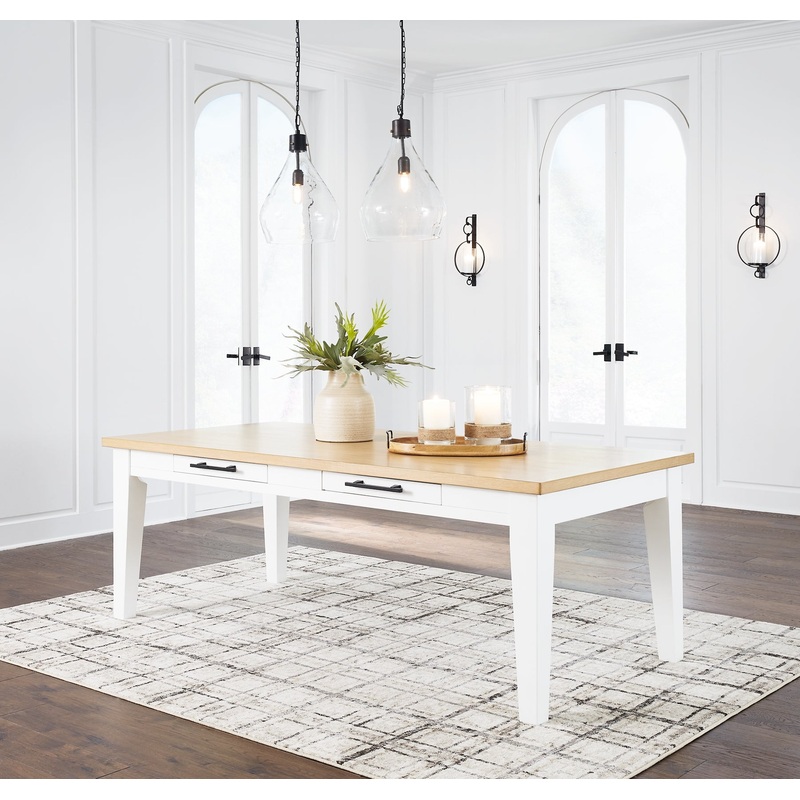 Casual style with substance. This dining table's two-tone finish of classic white and butcher block oak veneer adds a relaxed vibe to a delicious design. Convenient side drawers maximize space, while black bar pulls exude modern farmhouse vibes. This charm