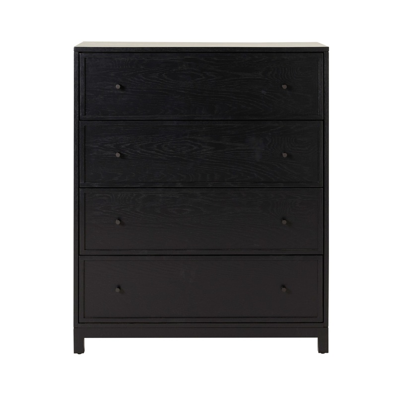 Bring a bold touch of modern design into your space with the Avalon 4 Drawer Chest in black. Made from oak, MDF, and oak veneer, it features clean lines and shadow line detailing, finished with a smooth nitrocellulose lacquer. The striking black colour sui