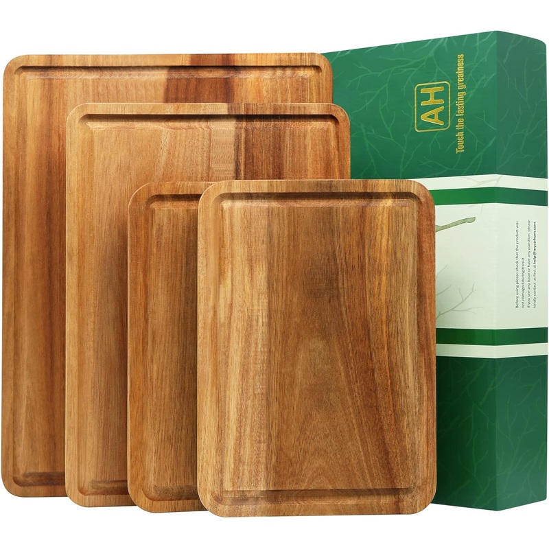 AZRHOM Large Wood Cutting Boards Set of 4 for Kitchen Cheese Charcuterie Board (Gift Box Included) Acacia Butcher Block with Non-slip Mats, Juice Groove and Handles (1612, 1410, double 118 inch) 4 PIECES + 3 SIZE IN ONE SET Comes in perfect size range, 3 d