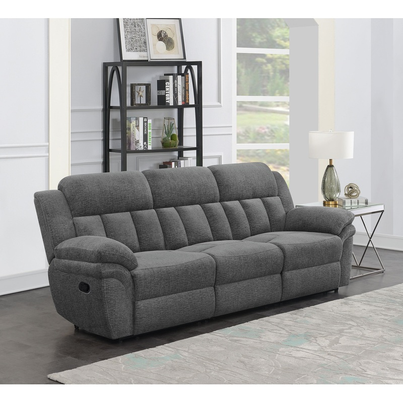 Design a living room built for comfort and relaxation around this transitional reclining sofa. Offering dual recliners operated with a side pull lever, the sofa encourages rest and rejuvenation in inviting style. Charcoal upholstery delivers a smooth, soft look and feel, while plush cushions are both supportive and comfortable for lounging. Pillowtop armrests are ideal for curling up on a cool evening or indulging in a quick afternoon nap. Tufting accents add support and structure to plush cushions while creating a dimensional look that works in your living room.