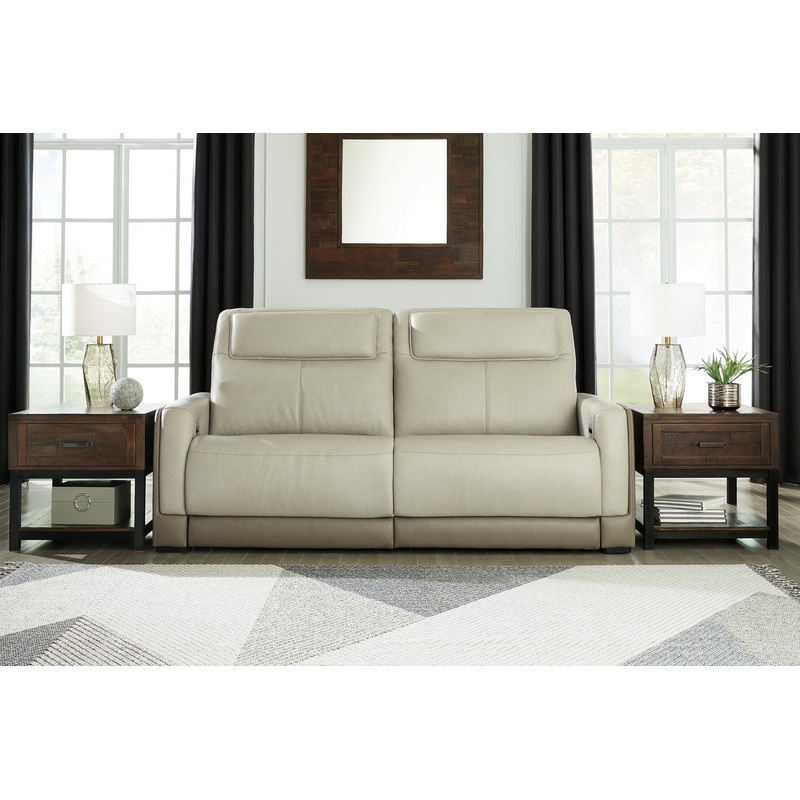 Double down on sleek style with this power reclining sofa. It has a streamlined, space-conscious appeal, with two-tone upholstery in neutral hues creating subtly striking visual intrigue. And with one-touch reclining, adjustable headrests and wireless char