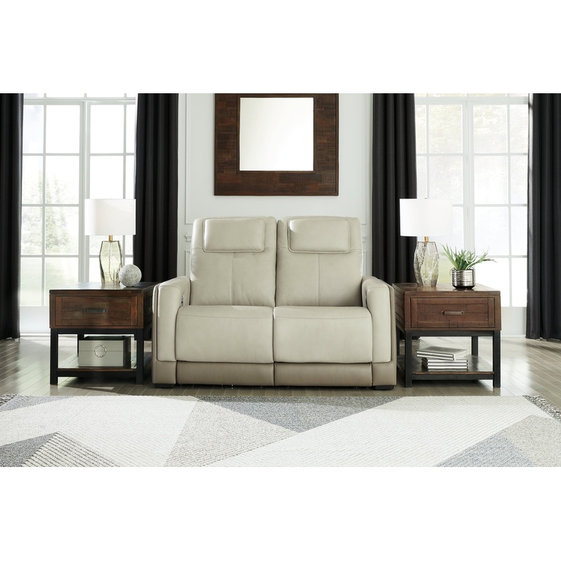 Double down on sleek style with this power reclining loveseat. It has a streamlined, space-conscious appeal, with two-tone upholstery in neutral hues creating subtly striking visual intrigue. And with one-touch reclining, adjustable headrests and wireless charging, this piece combines contemporary function and fashion into a single clean-lined design.