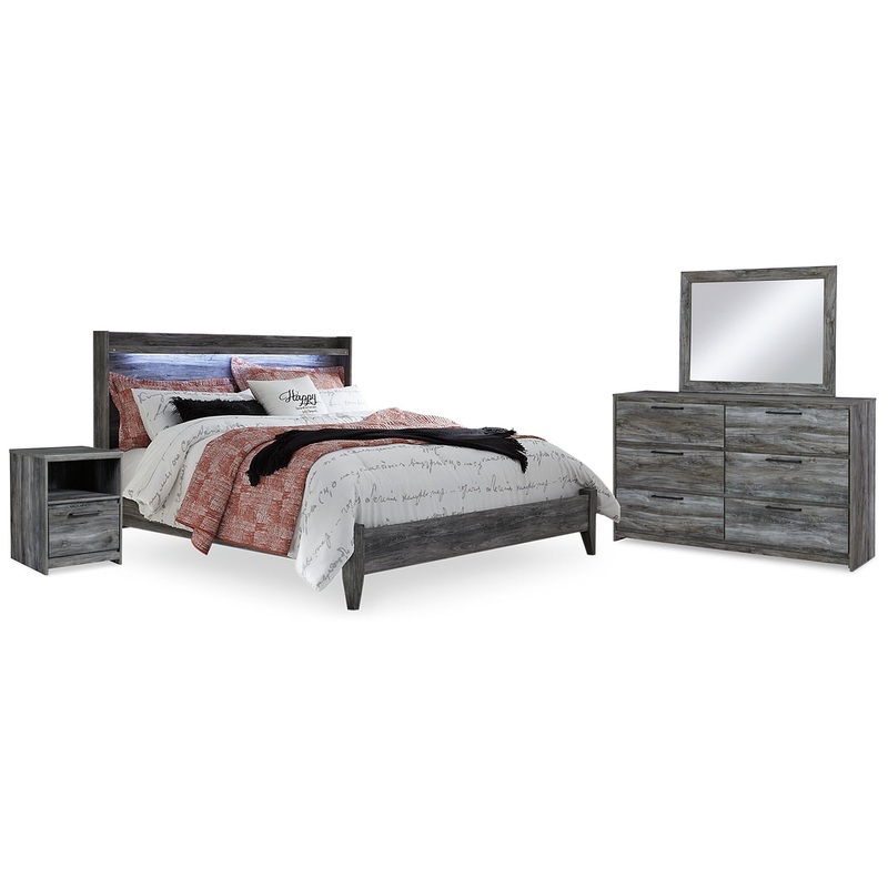 | Details | B221B11: Includes headboard, footboard and rails, Made with engineered wood (MDF/particleboard) and decorative laminate, Smoky gray finish over replicated oak grain with authentic touch, Foundation/box spring required, sold separately, Mattress available, sold separately, Assembly required, Bed is compatible with an adjustable base, B221B30: Includes dresser and mirror, Made with engineered wood (MDF/particleboard) and decorative laminate, Smoky gray finish over replicated oak grain with authentic touch, 6 smooth-gliding drawers, Linear pulls with antiqued gunmetal-tone finish, Faux linen finished drawer interiors, Mirror attaches to back of dresser; can also hang vertically or horizontally on wall, Safety is a top priority, clothing storage units are designed to meet the most current standard for stability, ASTM F 2057 (ASTM International), Drawers extend out to accommodate maximum access to drawer interior while maintaining safety, Assembly required, B221-91: Made of engineered wood (MDF/particleboard) and decorative laminate, Smoky gray finish over replicated oak grain, Linear pull with antiqued gunmetal finish, 1 smooth-gliding drawer and open cubby, Faux linen finished drawer interior, Slim-profile USB charging station, Power cord included; UL Listed, Small Space Solution, Assembly required, |