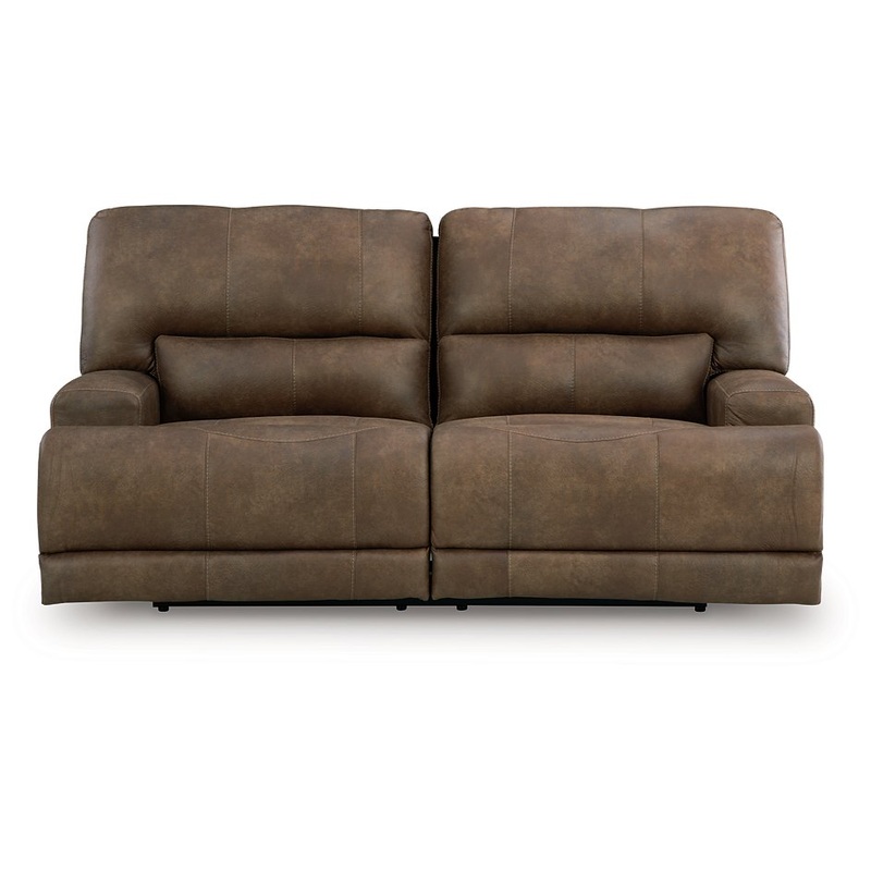 Expansive and elegant, this power reclining sofa makes a sizable style statement. Its large scale enhances the luxe look and magnifies the beauty of faux leather in an earth tone, punctuated with jumbo stitching. One-touch power adjustable headrests mean infinite ways to recline in stylish comfort. USB charging completes the experience.