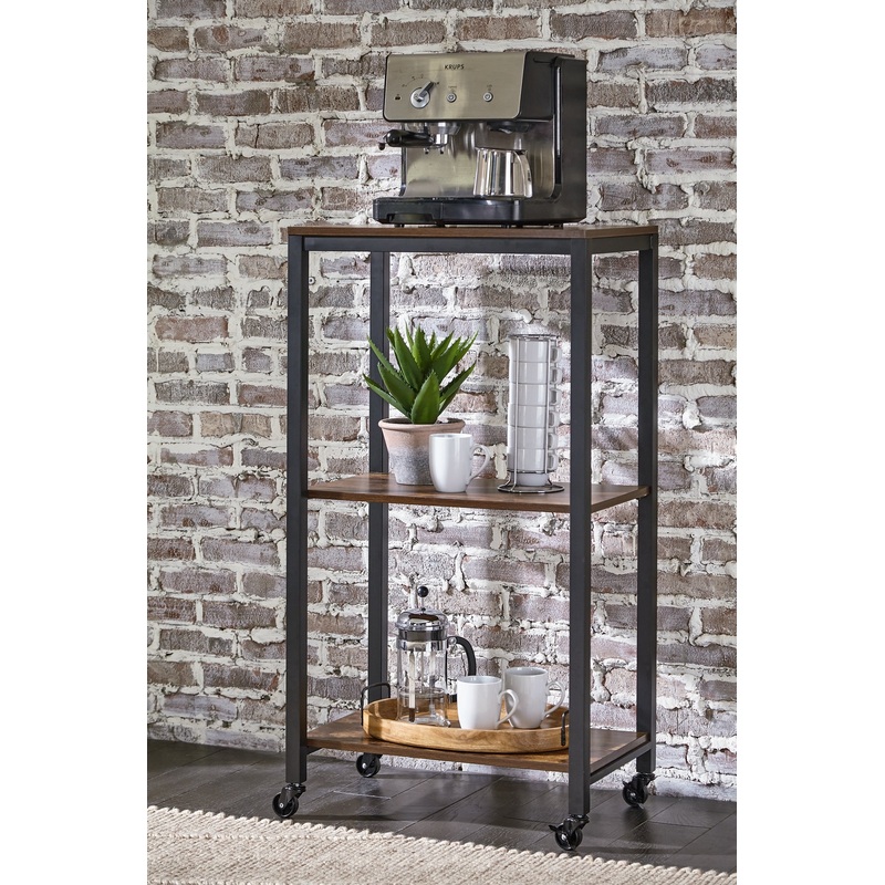 Details Made of engineered wood and decorative laminate, Replicated antiqued brown wood grain finish, Black metal frame, 3 shelves, Locking casters, Assembly required