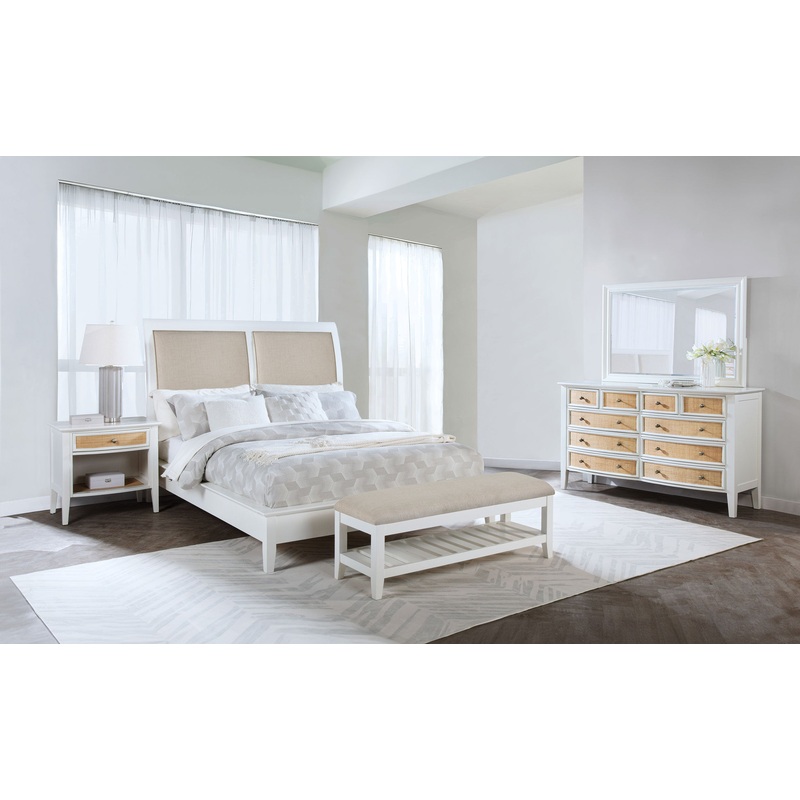 Textured rattan drawer fronts create a fresh, modern coastal aesthetic for this contemporary bedroom set. Offering ample storage and a clean look and feel, the set centers on a wooden bed with a gently flared, upholstered headboard with plush foam padding for easy comfort. The set includes a bright white finish, offering easy contrast to the rattan and linen-colored fabric upholstery that creates cool ambiance. Top drawers in the set include black felt lining and drawers are dotted with round metal knobs. The dresser includes a framed mirror while the nightstand offers both a drawer and a shelf for easy storage and decor.