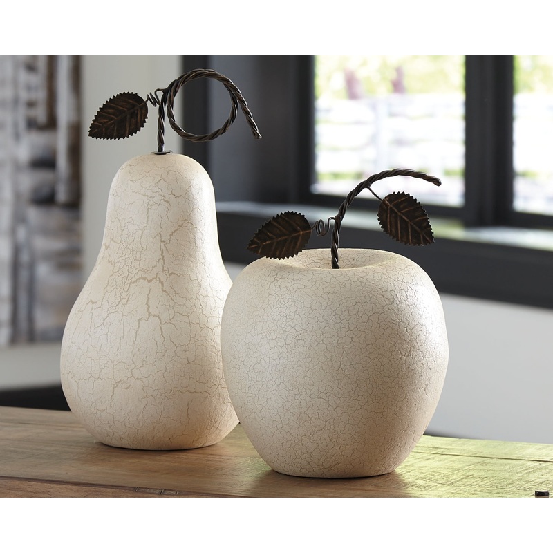 What a perfect pair. These apple and pear sculptures are artfully aged and scaled to fit almost anywhere. Display this delicious duo to give your space vintage appeal.SpecificationsHeight13.5inWidth7.38inDepth7.38inDetailsSet of 2, Made of paper composite