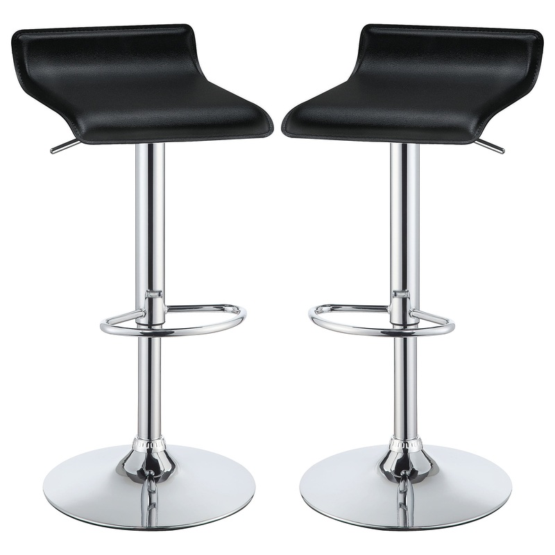 An adjustable barstool with a modern silhouette is a beautiful upgrade to any kitchen or lounge space. Featuring black upholstery, the stool features a curved seat that offers just the barest hint of a back. The seat is height adjustable to accommodate a range of table and counter heights. A chrome finish lends gleaming appeal to a pedestal base. A built-in footrest provides a final touch of comfort and support.