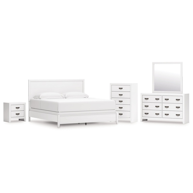 | Details | B427B8: Includes king panel headboard, footboard, rails and slats, Made with hardwood solids, okoume veneer and MDF substrates, White finish, Foundation/box spring required, sold separately, Mattress available, sold separately, Assembly required, B427B1: Includes dresser and mirror, Made with hardwood solids, okoume veneer and MDF substrates, White finish, 6 drawers with dovetail construction and metal center guides, Hardware with dark finish, Drawer interiors are lined with a wood grain laminate for a clean, finished look, Mirror attaches to back of dresser, B427-46: Made with hardwood solids, okoume veneer and MDF substrates, White finish, 5 drawers with dovetail construction and metal center guides, Hardware with dark finish, Drawer interiors are lined with a wood grain laminate for a clean, finished look, B427-92: Made with hardwood solids, okoume veneer and MDF substrates, White finish, 2 drawers with dovetail construction and metal center guides, Hardware with dark finish, Drawer interiors are lined with a clean wood grain laminate for a clean, finished look, |