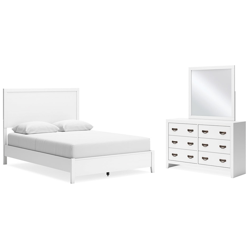 | Details | B427B6: Includes queen panel headboard, footboard, rails and slats, Made with hardwood solids, okoume veneer and MDF substrates, White finish, Foundation/box spring required, sold separately, Mattress available, sold separately, Assembly required, B427B1: Includes dresser and mirror, Made with hardwood solids, okoume veneer and MDF substrates, White finish, 6 drawers with dovetail construction and metal center guides, Hardware with dark finish, Drawer interiors are lined with a wood grain laminate for a clean, finished look, Mirror attaches to back of dresser, |