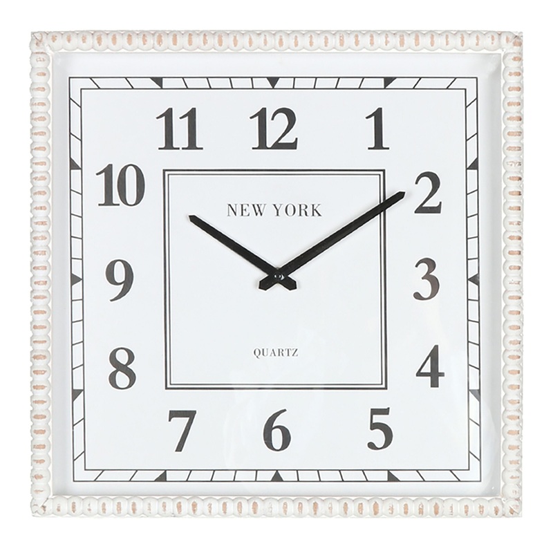 The Bobbled Timepiece Wall Clock brings an elegant touch to any room with its timeless design. Made from MDF, glass, and paper, it features an antique white finish with black hands and numbers. Inspired by classic wristwatches, this square clock boasts bobble detail on the edge and a glass lens for durability. The antiqued white wash appearance adds a coastal charm, with natural variations giving each clock a unique character. At 40cm, its the perfect size for your bedroom or home office, complementing any decor style.
