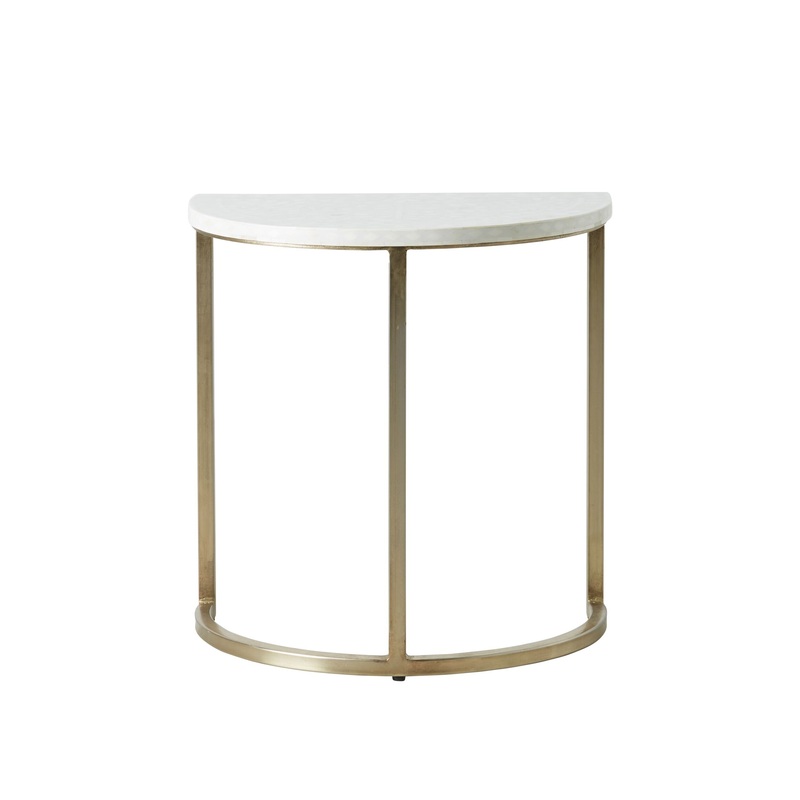 The Bone Inlay Half Moon Side Table Beige with Gold Frame (53cm) adds a touch of luxury and charm to any space. Crafted from buffalo bone inlay and featuring a sleek lacquer finish, this elegant table boasts a stunning combination of cream and gold hues. I