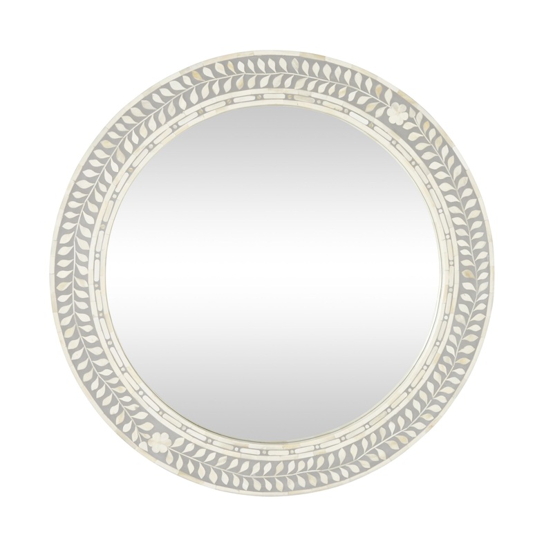 Elevate your interior with the Bone Inlay Round Mirror in grey and white. This stunning 90cm piece, handcrafted by skilled artisans in India, features a delicate floral and leaf pattern set against mirrored glass with a polished finish. Its classic and sty