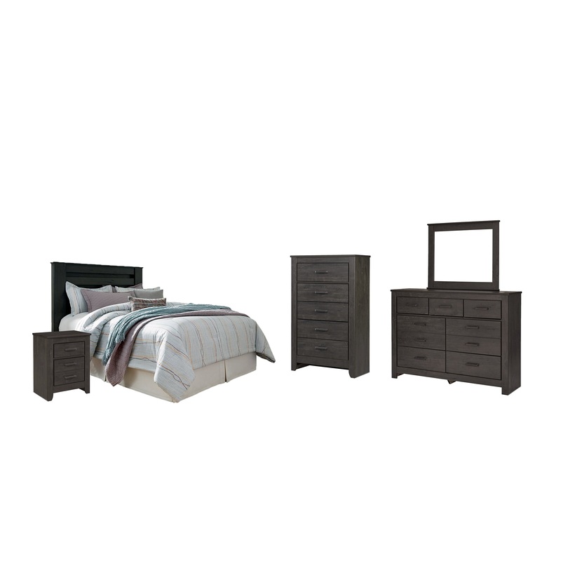 Details B249-46: Made with engineered wood (MDF/particleboard/plywood) and decorative laminate for the right balance of affordability and durability, Dark charcoal finish over replicated oak grain, Linear pulls with dark pewter-tone finish, 5 smooth-gliding drawers, Safety is a top priority, clothing storage units are designed to meet the most current standard for stability, ASTM F 2057 (ASTM International), Drawers extend out to accommodate maximum access to drawer interior while maintaining safety, Assembly required, B249-68: Hardware not included, Made with engineered wood (MDF/particleboard/plywood) and decorative laminate for the right balance of affordability and durability, Dark charcoal finish over replicated oak grain, ” bolts are needed to attach headboard to existing bed frame, Bolt length depends on thickness of your bed frame, Assembly required, B249-92: Made with engineered wood (MDF/particleboard/plywood) and decorative laminate for the right balance of affordability and durability, Dark charcoal finish over replicated oak grain, Linear pulls with dark pewter-tone finish, 2 smooth-gliding drawers, Assembly required, B249B1: Includes dresser and mirror, Made with engineered wood and decorative laminate, Dark charcoal finish over replicated oak grain, 7 smooth-gliding drawers; 3 drawer sizes, Linear pulls with dark pewter-tone finish, Mirror attaches to back of dresser, Safety is a top priority, clothing storage units are designed to meet the most current standard for stability, ASTM F 2057 (ASTM International), Drawers extend out to accommodate maximum access to drawer interior while maintaining safety, Assembly required,