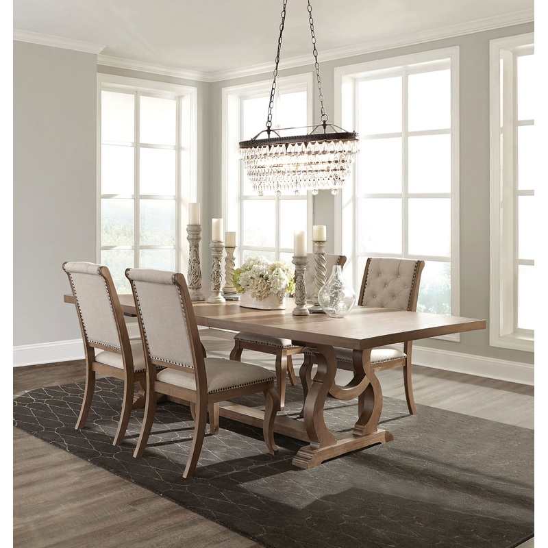 Terrifically transitional with subtle glam details comes this wood and upholstered dining set. Including a 20 removable extension leaf, this beautiful wood dining table is finished in a natural wood color with distressed wood grain accents. The dual pedest