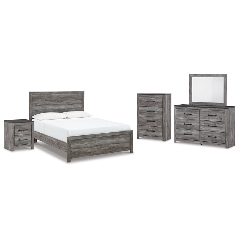 | Details | B1290B2: Includes queen panel headboard/footboard and rails, Made with engineered wood (MDF/particleboard/plywood) and decorative laminate for the right balance of affordability and durability, Smoky gray finish over replicated oak grain with authentic touch, Decorative laminate replicates natural or man-made material surfaces with consistent color, pattern and texture, Foundation/box spring required, sold separately, Mattress available, sold separately, Assembly required, Bed is compatible with an adjustable base, B1290B1: Includes dresser and mirror, Made with engineered wood (MDF/particleboard/plywood) and decorative laminate for the right balance of affordability and durability, Two-tone look: smoky gray replicated oak grain accented with rustic charcoal finish; replicated oak grain with authentic touch, Charcoal finish over replicated oak grain with authentic touch, Decorative laminate replicates natural or man-made material surfaces with consistent color, pattern and texture, Large-scaled handles in a dark hue, 6 smooth-gliding drawers with dovetail construction, Drawer interiors are lined with a faux linen laminate for a clean, finished look, Framed front and pilasters, Mirror attaches to back of dresser; can also be mounted on wall horizontally or vertically, Safety is a top priority, clothing storage units are designed to meet the most current standard for stability, ASTM F 2057 (ASTM International), Drawers extend out to accommodate maximum access to drawer interior while maintaining safety, Assembly required, B1290-44: Expertly made with engineered wood (MDF/particleboard/plywood) for the right balance of affordability and durability, Decorative laminate replicates natural or man-made material surfaces with consistent color, pattern and texture, Two-tone look: smoky gray replicated oak grain accented with rustic charcoal finish; replicated oak grain with authentic touch, Large-scaled handles in a dark hue, 4 smooth-gliding drawers with dovetail construction, Drawer interiors are lined with a faux linen laminate for a clean, finished look, Framed front and pilasters, Safety is a top priority, clothing storage units are designed to meet the most current standard for stability, ASTM F 2057 (ASTM International), Drawers extend out to accommodate maximum access to drawer interior while maintaining safety, Assembly required, B1290-92: Expertly made with engineered wood (MDF/particleboard) for the right balance of affordability and durability, Decorative laminate replicates natural or man-made material surfaces with consistent color, pattern and texture, Two-tone look: smoky gray replicated oak grain accented with rustic charcoal finish; replicated oak grain with authentic touch, Large-scaled handles in a dark hue, 2 smooth-gliding drawers with dovetail construction, Drawer interiors are lined with a faux linen laminate for a clean, finished look, Framed front and pilasters, Assembly required, |