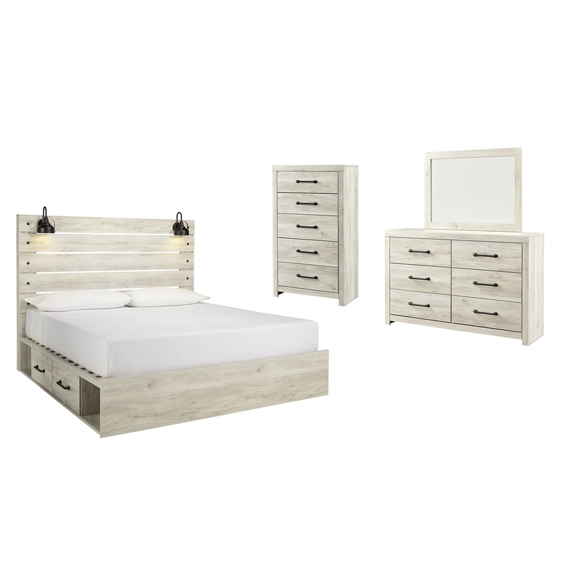 Whether you lean towards modern loft or modern farmhouse, this panel storage bed, chest of drawers and dresser with mirror tip the balance in your favor. The wispy whitewash finish enhances the style without covering the grain for that weathered look you just cant get enough of. Love to read in bed? Youre sure to find the retro-chic light sconces and USB plug-ins on the open-slat style headboard to be a totally bright idea, while the elongated metal drawer pulls really elevate the aesthetic. What a delightful take on rustic industrial style.