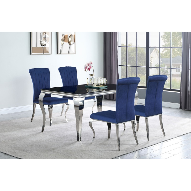 Experience the Carone dining set, seamlessly fusing modern design with timeless elements. The table’s stainless steel legs bring sophistication, curving artistically and contrasting the 12mm tempered glass top with beveled edges. Hosting formal feasts is effortless on this table. Complementing this, the elegant dining chairs exude sleek sophistication. Their chrome-finished legs, including creatively curved front legs, offer a captivating shine. Luxe velvet upholstery graces the seats, available in various colors to personalize your space. Elevate your dining area with the Carone collection, where innovation meets opulence.