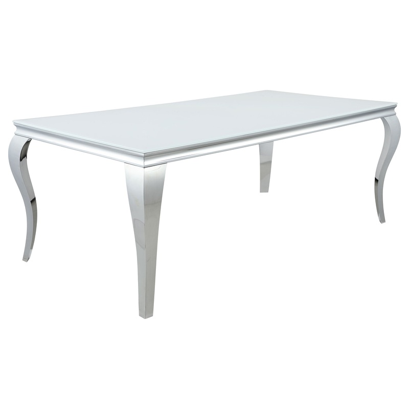 Glamorous with a luxurious touch, this elegant dining table makes the perfect addition to a formal dining space. With a mixed material design of durable stainless steel and glass, this dining table lends itself to several home decor styles. On each traditional Cabriole style leg is a gleaming chrome finish. Gather family and guests around the opaque tempered glass tabletop. In addition, this dining table seats six people comfortably.