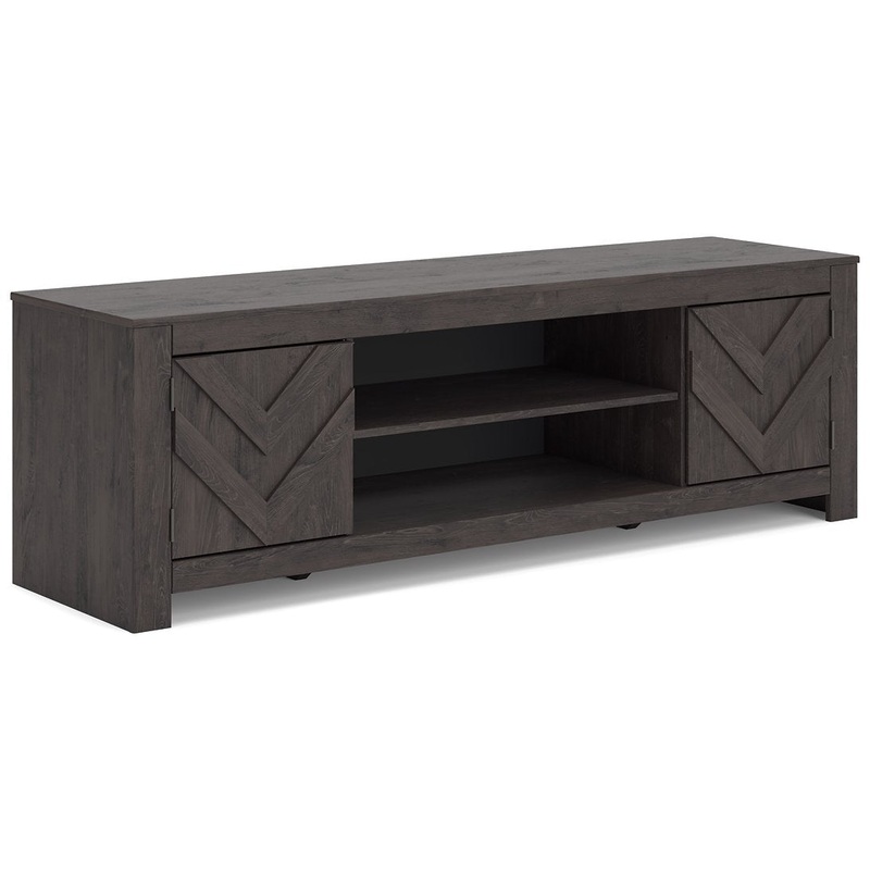 This TV stand embraces a classically charming aesthetic and repurposes it for modern living. Its dark charcoal finish to your love of vintage character, while the chic chevron pattern is effortlessly on trend. And with hidden storage behind the doors, your