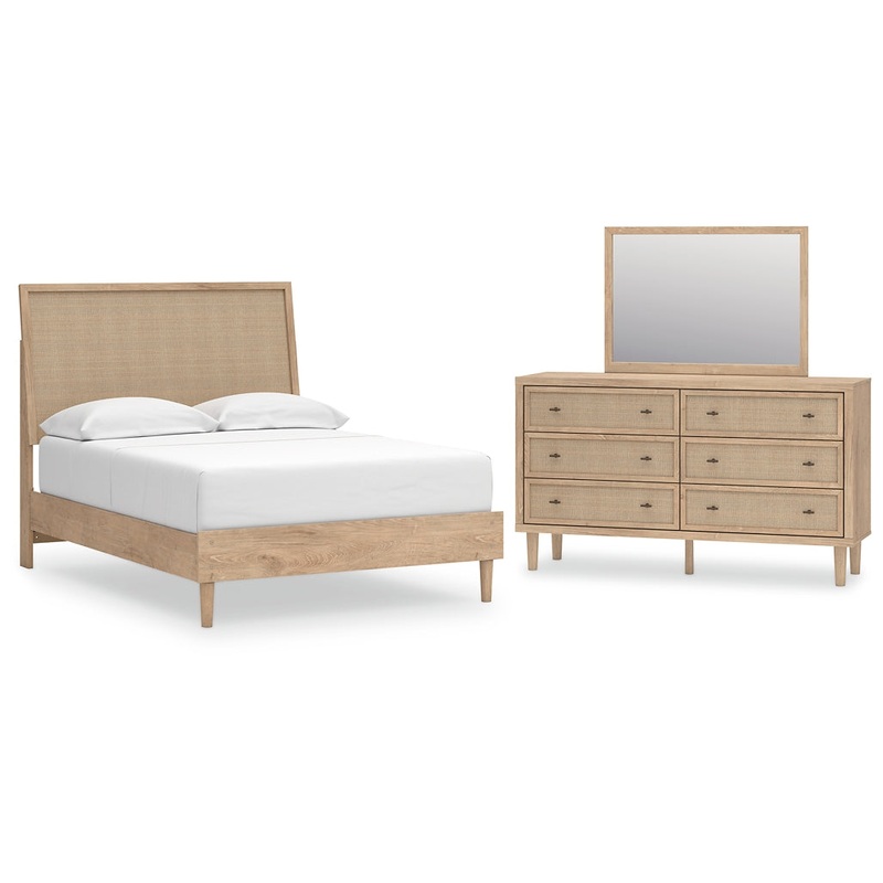 Details B1199B6: Includes panel headboard, footboard, rails and roll slats, Made with engineered wood (MDF/particleboard/plywood) and decorative laminate for the right balance of affordability and durability , Dry, light finish with replicated oak grain and authentic touch, Decorative laminate replicates natural or man-made material surfaces with consistent color, pattern and texture , Headboard panel with textured beige finish that replicates the look of cane , Bed does not require additional foundation/box spring; accommodates most zero clearance adjustable bases , Mattress available, sold separately , Minor assembly required, B1199B1: Includes dresser and mirror, Made with engineered wood (MDF/particleboard/plywood) and decorative laminate for the right balance of affordability and durability, Dry, light finish with replicated oak grain and authentic touch, Decorative laminate replicates natural or man-made material surfaces with consistent color, pattern and texture , Dresser with framed front and pilasters, Framed drawer fronts with replicated beige cane finish, Bronze-tone knobs, 6 smooth-gliding drawers , Drawer interiors are lined with a faux linen laminate for a clean, finished look, Safety is a top priority, clothing storage units are designed to meet the most current standard for stability, ASTM F 2057 (ASTM International), Drawers extend out to accommodate maximum access to drawer interior while maintaining safety, Mirror attaches to back of dresser; can also be mounted on wall horizontally or vertically, Minor assembly required, simply lay flat and attach feet,