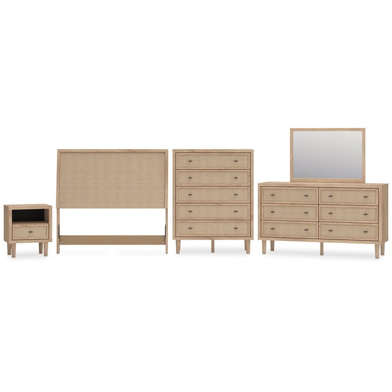 Clean-lined and contemporarybut far from starkthis bedroom package is a fresh style awakening. Pairing a light finish with replicated oak grain and textured beige details that replicate the look of cane, its mixed materials bring a naturally versatile vibe to your bedroom. Sleek, simple hardware plays perfectly with the modern aesthetic.