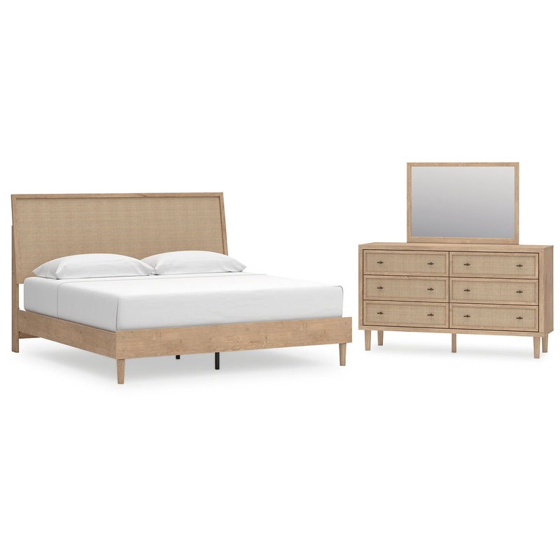 | Details | B1199B5: Includes panel headboard, footboard, rails and roll slats, Made with engineered wood (MDF/particleboard/plywood) and decorative laminate for the right balance of affordability and durability , Dry, light finish with replicated oak grain and authentic touch, Decorative laminate replicates natural or man-made material surfaces with consistent color, pattern and texture , Headboard panel with textured beige finish that replicates the look of cane , Bed does not require additional foundation/box spring; accommodates most zero clearance adjustable bases , Mattress available, sold separately , Minor assembly required, B1199B1: Includes dresser and mirror, Made with engineered wood (MDF/particleboard/plywood) and decorative laminate for the right balance of affordability and durability, Dry, light finish with replicated oak grain and authentic touch, Decorative laminate replicates natural or man-made material surfaces with consistent color, pattern and texture , Dresser with framed front and pilasters, Framed drawer fronts with replicated beige cane finish, Bronze-tone knobs, 6 smooth-gliding drawers , Drawer interiors are lined with a faux linen laminate for a clean, finished look, Safety is a top priority, clothing storage units are designed to meet the most current standard for stability, ASTM F 2057 (ASTM International), Drawers extend out to accommodate maximum access to drawer interior while maintaining safety, Mirror attaches to back of dresser; can also be mounted on wall horizontally or vertically, Minor assembly required, simply lay flat and attach feet, |