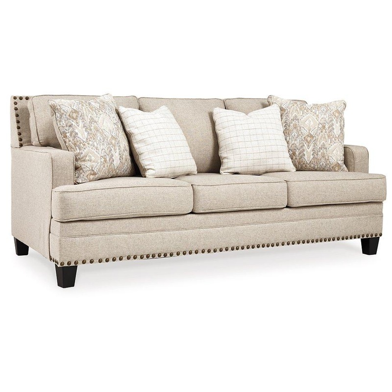 A case of contemporary and classic style influences coming together in a beautiful way, this sofa in beige brings a fresh perspective to modern farmhouse living. Distinctive elements include t-cushions that wrap around setback track arms, nailhead trim and a lovely linen-weave upholstery for an up-to-date feel. Muted hue designer throw pillows master the art of subtlety.