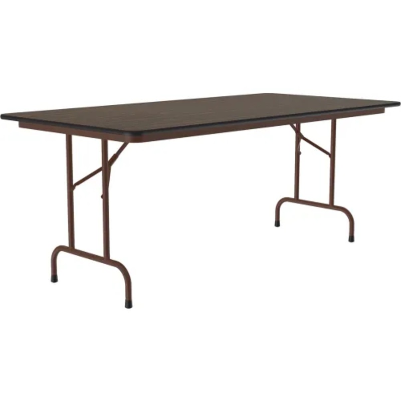 Superior construction features built into these versatile tables ensure long, reliable service. Gravity operated locking device secures the tubular steel folding legs in the open position. Solid core top is channel braced for added support and bound with heavy T-molding. Height is 29″, folds to a compact 3″ thick for easy storage. Brown enamel frame. Walnut laminate finish. 5 Year Limited Warranty.
