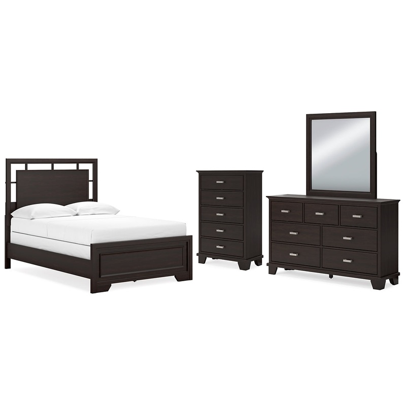 | Details | B441B4: Includes panel headboard, footboard, rails and slats, Made with hardwood solids, engineered wood veneer and MDF substrates, Dark brown finish, Floating panel headboard, Picture frame footboard, Foundation/box spring required, sold separately , Mattress available, sold separately, Assembly required, B441B1: Includes dresser and mirror, Made with hardwood solids, engineered wood veneer and MDF substrates, Dark brown finish, Metal bar pulls with bright nickel-tone finish, 7 smooth-gliding drawers with dovetail construction and metal center guides, Drawer interiors are lined with a wood grain laminate for a clean, finished look, Top moulding on dresser, Mirror attaches to back of dresser, B441-46: Made with hardwood solids, engineered wood veneer and MDF substrates, Dark brown finish, Metal bar pulls with bright nickel-tone finish, 5 smooth-gliding drawers with dovetail construction and metal center guides, Drawer interiors are lined with a wood grain laminate for a clean, finished look, Top moulding, |