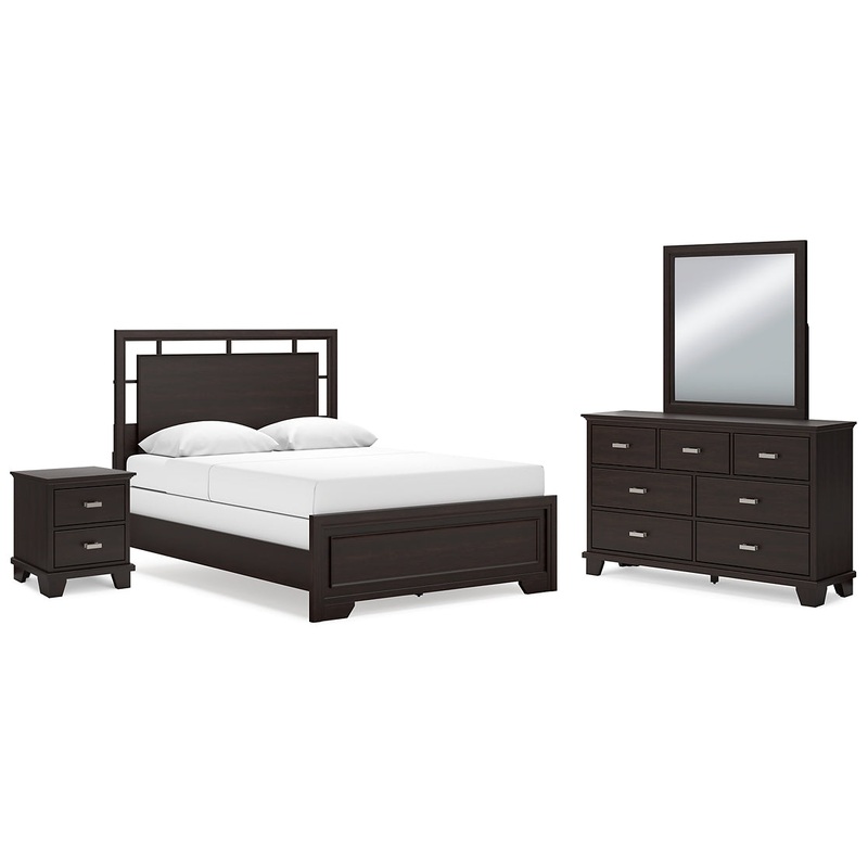 | Details | B441B6: Includes panel headboard, footboard, rails and slats, Made with hardwood solids, engineered wood veneer and MDF substrates, Dark brown finish, Floating panel headboard, Picture frame footboard, Foundation/box spring required, sold separately , Mattress available, sold separately, Assembly required, B441B1: Includes dresser and mirror, Made with hardwood solids, engineered wood veneer and MDF substrates, Dark brown finish, Metal bar pulls with bright nickel-tone finish, 7 smooth-gliding drawers with dovetail construction and metal center guides, Drawer interiors are lined with a wood grain laminate for a clean, finished look, Top moulding on dresser, Mirror attaches to back of dresser, B441-92: Made with hardwood solids, engineered wood veneer and MDF substrates, Dark brown finish, Metal bar pulls with bright nickel-tone finish, 2 smooth-gliding drawers with dovetail construction and metal center guides, Drawer interiors are lined with a wood grain laminate for a clean, finished look, Top moulding, |