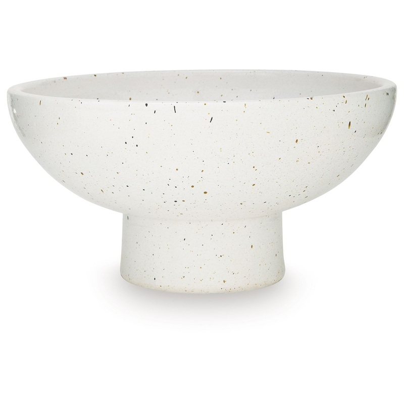 This eye-catching bowl, with its delicate black speckles, is the perfect statement piece to elevate your tablescape. Crafted from glazed terra cotta, its a magnificent vessel to store fresh fruit or to serve your favorite side dishes. And what a great spot for keys, earbuds and so much more. This bowl stands beautifully on its own, or as part of a splendidly stylish trio with the coordinating vases (sold separately).
