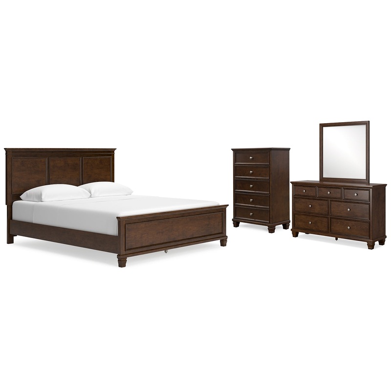 Details B685B5: Includes California king panel headboard, footboard and rails, Made with hardwood solids, birch veneer and MDF substrate, Brownish cherry finish, Tapered feet, Assembly required, Bed is compatible with an adjustable base, Foundation/box spring required, sold separately, Mattress available, sold separately, B685B1: Includes dresser and mirror, Made with hardwood solids, birch veneer and MDF substrate, Brownish cherry finish, 7 smooth-gliding drawers with dovetail construction and ball-bearing side glides, Round metal drawer knobs with satin nickel-tone finish, Tapered feet, Framed drawer fronts, Mirror attaches to back of dresser, Assembly required, B685-46: Made with hardwood solids, birch veneer and MDF substrate, Brownish cherry finish, 5 smooth-gliding drawers with dovetail construction and ball-bearing side glides, Round metal drawer knobs with satin nickel-tone finish, Tapered feet, Framed drawer fronts,