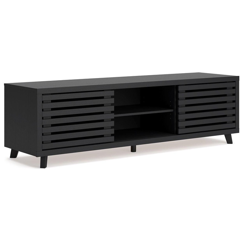 Entertain the art of modern living with this TV stand. Pairing a subtle wood grain look with a trend-right matte black finish, its beautifully in tune with your clean-lined design sensibility. Packed with potential, two sliding doors reveal even more adjus