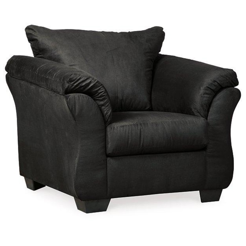 Talk about fine lines and great curves. Thats the beauty of this standout chairmade to suit your appreciation for simplicity and love of contemporary style. A striking flared frame, comfy pillow top armrests and an ultra-soft upholstery that holds up to everyday living complete this fashion statement.