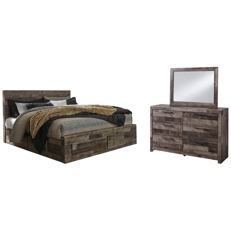 Derekson King Panel Bed with 4 Storage Drawers with Mirrored Dresser