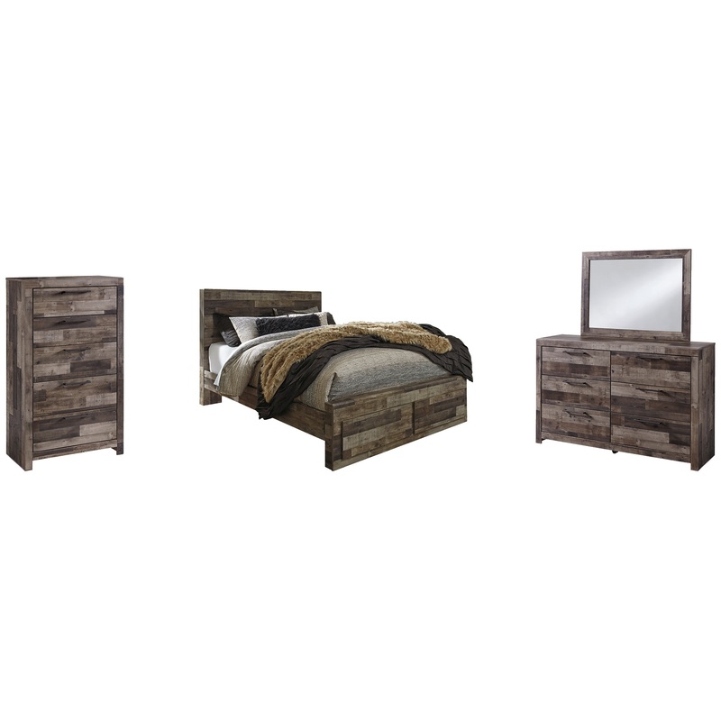 Derekson Queen Panel Bed with 2 Storage Drawers with Mirrored Dresser and Chest