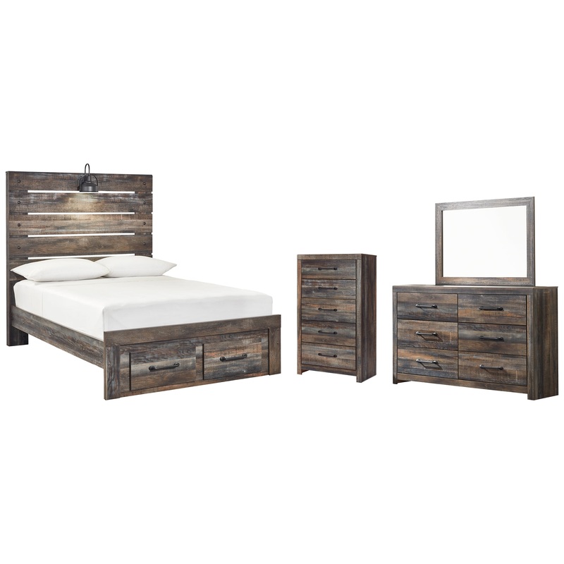 Drystan Full Panel Bed with 2 Storage Drawers with Mirrored Dresser and Chest