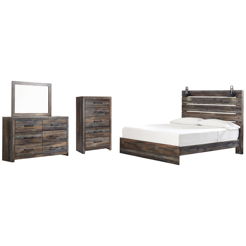 When merged in just the right way, rustic and industrial styles can make one happy marriage. Case in point: this bedroom set with panel bed, dresser/mirror and chest. A refined take on barn board beauty, its complex, replicated wood grain showcases hints of burnt orange and teal tones for a sense of weatherworn authenticity. Love to read in bed? Youre sure to find the retro-chic light sconces and USB plug-ins on the open-slat style headboard such a bright idea. Elongated metal drawer pulls elevate the aesthetic.