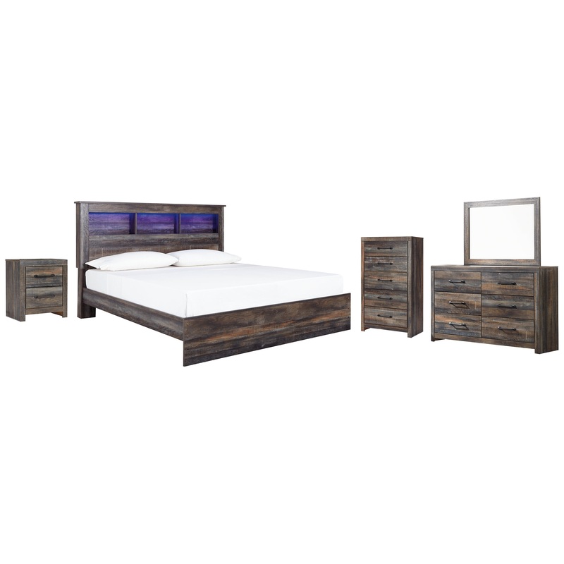 This king-size panel bookcase bed, dresser, mirror, chest of drawers and nightstand is a refined take on barn board beauty. Its complex, replicated wood grain showcases hints of burnt orange and teal tones for a sense of weatherworn authenticity. Three open cubbies lined with a dimming LED light strip keep bedtime reads top of mind. The dresser, chest and nightstand with smooth-gliding drawers lined with faux linen laminate and industrial dark-tone hardware complete this rustic and industrial style bedroom. Mattress and foundation/box spring available, sold separately.