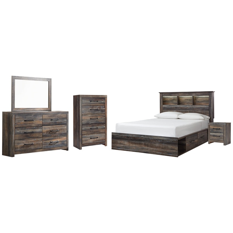 When merged in just the right way, rustic and industrial styles can make one happy marriage. Case in point: this bedroom set with bookcase bed with underbed storage, dresser/mirror, chest and nightstand. A refined take on barn board beauty, its complex, re
