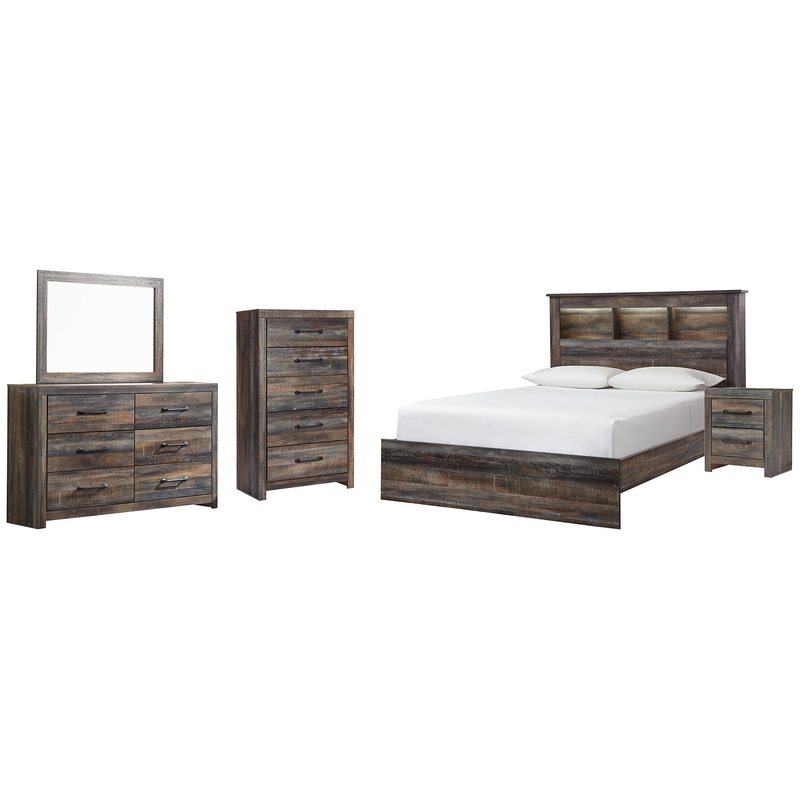 When merged in just the right way, rustic and industrial styles can make one happy marriage. Case in point: the Drystan queen bookcase bed, dresser/mirror, chest and nightstand. A refined take on barn board beauty, its complex, replicated wood grain showca